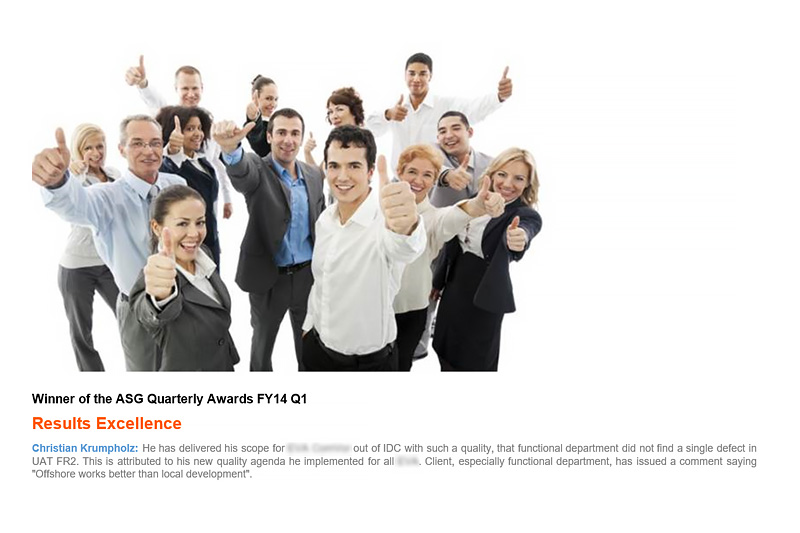 Over this year I was also responsible to lead the 3rd level application maintenance support, the quality assurance and I was involved in a performance improvement taskforce and extension of the test concept for the current customer.